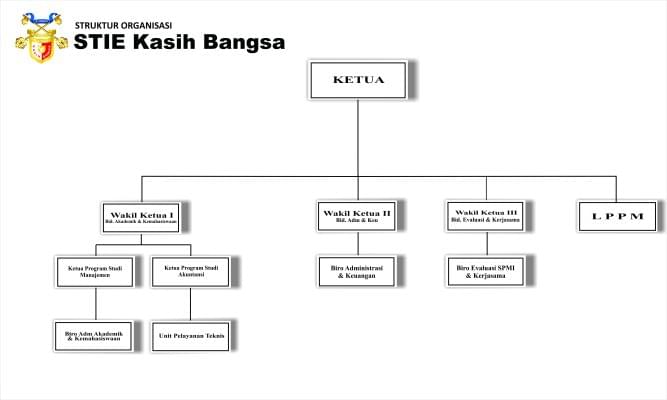 STIE Kasih Bangsa yang saat ini memiliki 2 (dua) Program Studi yaitu Program Studi Akuntansi dan Program Studi Manajemen dikelola dengan berpedoman pada dokumen SOTK yang mengacu pada Statuta sebagai peraturan dasar dalam pengelolaan STIE Kasih Bangsa. Bagan struktur organisasi STIE Kasih Bangsa adalah sebagai berikut :